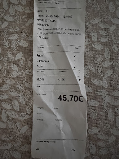 Read moreDesastre total! Nos sentamos en la terraza 3 personas y desde que pedimos la comida (3 platos de pasta solamente) hasta que la trajeron, pasaron 1 hora y 25 minutos. Cuando llevábamos ya un buen rato esperando, pregunte a la camarera cuanto le faltaba y me contesto que ya estaban saliendo (mentira gorda porque esperamos otros 30 minutos mas. Cuando por fin sale los platos, solo trae uno que tuvo que comerse una persona mientras todos mirábamos. Tuve que volver a pasar dentro del local a preguntar cuando narices le faltaban a los demás platos. Los camareros en la terraza brillaban por si ausencia, solamente pusieron música alta para disimular el desastre. Pedimos espagueti con trufa, nata y champiñones; pues bien, solo sabia a nata, la trufa brillaba por su ausencia al igual que los champiñones solo había 4 trozos diminutos. El sitio es caro, la comida insípida y el servicio un DESASTRE. No volveré jamás. Adjunto ticket porque ni si quiera se puede ver con claridad porque...