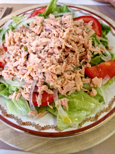 We had a late lunch (around 3 pm) at this restaurant. There was only one waiter and he tried his best to serve us and the other customers. We were offered a set lunch of 12€ which included a first course, a second course (mains) and tea or coffee. I love the first course dishes of tuna salad and presunto with slices of melons. The helping was generous and yummy. The main dishes were alright but the fries were a tad dry. We rounded off the mean with...