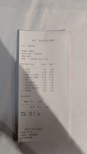 Read moreMenú degustacion n 3 el rincón de norat Pulpo correoso y bañado en aceite lo deje entero prácticamente, estuve apunto de devolver el plato era una aberración a un icono de la gastronomía gallega Langostinos pasados costaba pelarlos más que los de un wok,una manera increíble de estropear un marisco de buena calidad El marisco de concha tanto mejillones y almejas vapor y en salsa estaban bien cocinados, buena textura e increíble sabor a mar como debe de ser al lado de la ría. Las vieiras normales tirando a malas muy graso en la boca y la carne tirando a dura pero comestibles Postre volcán de chocolate Tras la decepción brutal de lo anterior tenia la esperanza de que esto reparará el daño causado a mi paladar pero tuve que esperar más de 15 minutos y nada del otro mundo . He ido a muchos restaurantes en mi vida buenos y malos y hasta en el peor de todos el volcán de chocolate estaba derretido en el centro en este no era el caso Eso sí el trato del personal fue ejemplar y me gusta que me traten bien cuando salgo a un restaurante pero por muy bien que te traten si la comida no acompaña se arruina toda...