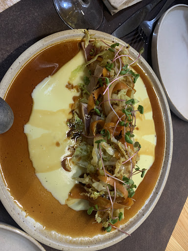 Read moreHabíamos reservado para 5 personas. Con ilusión, pues me gusta ver como gente muy profesional de la zona desarrolla sus proyectos marcando diferencia con la oferta general del pueblo. Me habían hablado muy bien del local y tenía muchas ganas de compartir esta experiencia con amigos que estaban de paso. El camarero estaba solo, tardo 10min en traer la carta, 30min en traer las bebidas y finalmente el primer plato llegó después de 50min de habernos sentado. Excusandose detrás de "el concepto del restaurante es" nos aclaro que los platos salían de uno en uno; "la cocina va lenta hoy" también decía, incluso a la hora de pagar hubo que pedir la cuenta tres veces, "la están haciendo"... Tardamos 2h y media en acabar de cenar sin pedir postre. La comida estaba buena, el producto principal de calidad pero cubierto con salsas que se repetían en distintas elaboraciones y que tapaban en cierta forma la calidad. No...