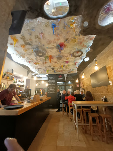 Read moreDecidimos acercarnos a cenar para celebrar nuestro aniversario de boda y la verdad es que nos encantó. Nos decidimos por que tiene varias opciones para personas veganas bastante fuera de lo común, asique probamos (yo soy vegana pero mi marido es omnívoro y buscamos lugares aptos para los dos) El lugar es muy acogedor y bonito al mismo que tiempo que moderno. Lo que más me gustó de la estética fue el techo de la entrada principal, tan colorido y original, transmite felicidad. Y después algo que me pareció super inspirador y original fue la exposición de fotografía que tienen en las paredes (colaboran con un fotógrafo local y las obras se pueden comprar) El personal fue encantador. La chica que nos atendió super amable y atenta, muy enterada de los ingredientes de los platos y de cuales eran o no aptos y el porqué (lo primero que me preguntó cuando le dije que era vegana fue: eres vegana u ovolacteo). Sin duda si tenéis algún tipo de restricción alimentaria el personal sabrá responder a vuestras necesidades. La comida nos sorprendió mucho, utilizan productos básicos de la zona para hacer platos muy diferentes, incluso mi marido que es muy raro para las comidas salió encantado. Con las bebidas nos pusieron 2 tapas, una apta para mi y otra apta para él. Pedimos 3 platos, 2 postres, 3 bebidas y 2 cafés y nos salió por 50€(nos sobró comida y nos la llevamos para casa). Los precios son bastante asequibles. El único pero que le pongo es que ayer justo hacía bastante frío y tenían abierta la puerta que dá a la terraza y nuestra mesa estaba cerca y terminó por...