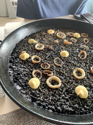 Comimos unas croquetas de gambas al ajillo que estaban riquísimas! 😋 unas volandeiras a la plancha en su punto, un arroz negro con calamar y salsa alioli que estaba para ponerle un monumento, tan rico que si más hubiera, más comíamos 😂 los niños tomaron 2 hamburguesas Gourmet de ternera con queso cremoso de San Simón, con salsa de yema macerada y clara frita con un pan súper rico, les encantó.