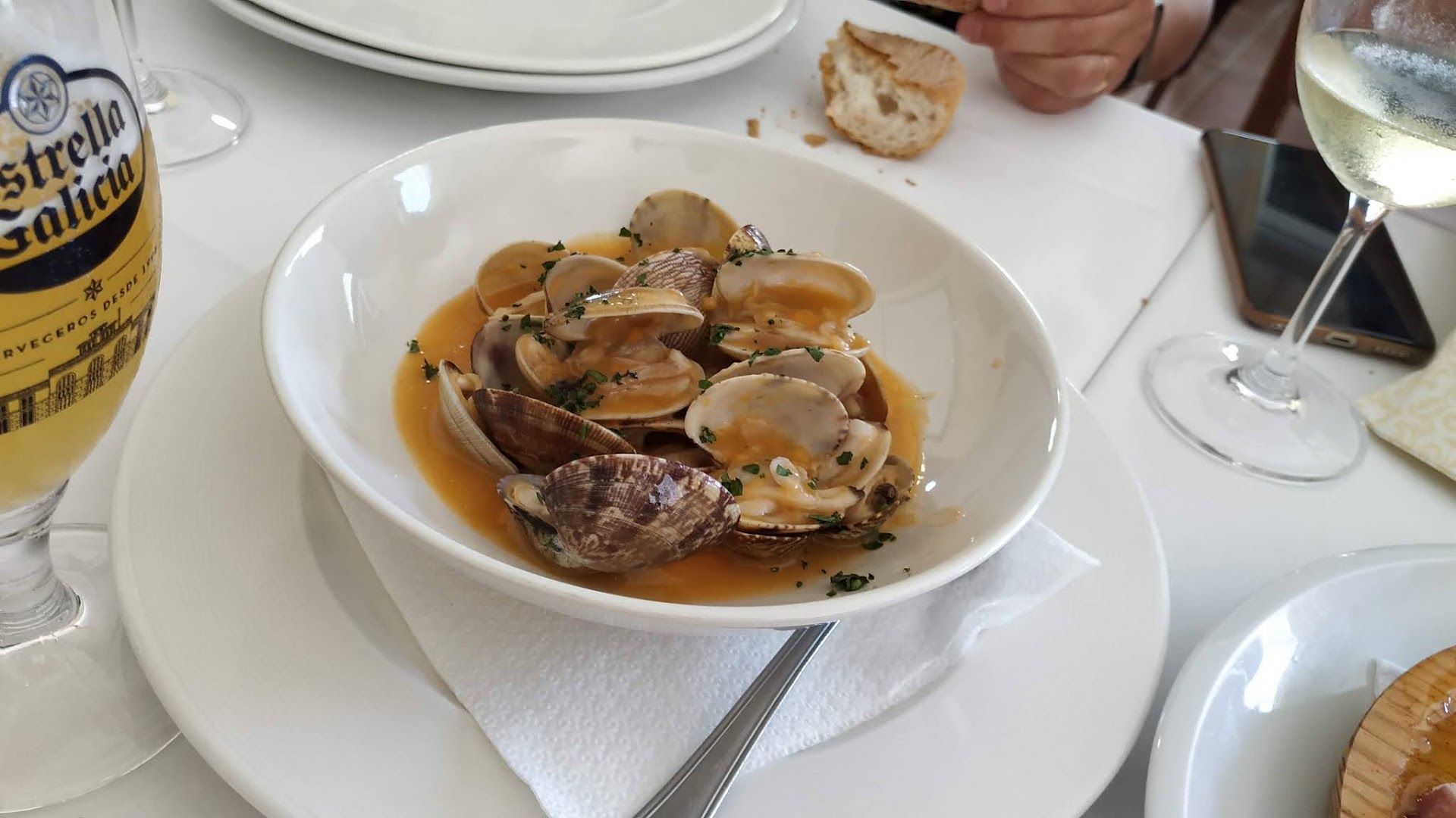 Como siempre, habíamos reservado mesa previamente para no tener sorpresas al llegar. Dos, de las cinco personas que íbamos a comer llegamos un poco antes de la hora y ya tenían nuestra mesa preparada, así que fuimos entrando y tomando algo mientras llegaban los demás. Con la bebida que pedimos nos dieron un pincho para acompañar. Para empezar, de entrantes pedimos unas almejas a la marinera (espectaculares) y un pulpo a la gallega. Después, tomamos un arroz con pulpo para dos personas (muy bueno y en una cantidad generosa, tanto de arroz como de pulpo), otros dos comensales tomaron una caldeirada de pescado, que me comentaron que estaba muy buena y el ultimo una merluza rebozada de la que tampoco pudo hablar nada malo. Para terminar, nos atrevimos con un flan de queso y unas filloas rellenas. Por último unos cafés para reposar la comida.