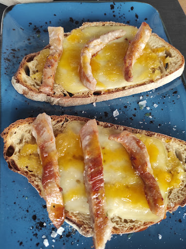 Respecto a la comida: pedimos una ración de croquetas de pulpo para compartir y he de decir que estaban muy ricas, se notaba que las bechamel estaba hecha con el propio agua donde cocieron el pulpo y eso potenciaba su sabor. En cuanto a las tostas, aquí viene lo triste de la historia. Únicamente se salvó la tosta de chipirones con alioli que era la que más buena estaba de todas. La tosta de pulpo, se pasaron un poco/bastante con el pimentón, lo que camuflaba el sabor del pulpo... Y la decepción total fue la tosta de secreto con chutney de piña. Tal y como se aprecia en la foto, es un auténtico despropósito cobrar 13€ por 3 miserias tiras de secreto por tosta (se ve claramente como las otras 2 todas sí que venían bastante llenas en comparación a la de secreto), ya que al final se convierte en pan con queso y mermelada de piña. La verdad para mí, es un auténtico timo y NO la recomiendo.