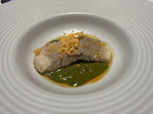 El miércoles degustamos el menú Cloe con maridaje. Extraordinaria cocina con una gran variedad de materias primas, elaboraciones y texturas. Desde la falsa pero impactante y rompedora aceituna en una innovadora versión de la clásica gilda para abrir boca, pasando por sólo mencionar algunos, por un tartar de choco y mango con un helado con agua de las burgas infusionado con hierbaluisa y alguna otra hierba galega, o un pulpo con una costra de tinta de choco ( cocina de aprovechamiento ) hasta su famosa torrija caramelizada que superó las expectativas. En realidad los 13 platos han sido un deleite. Bocados exquisitos con una esmerada preparación y una cuidada y original presentación, en un ambiente tranquilo y relajado. Mención aparte para el sumiller que nos ofreció unos vinos sorprendentes con maridajes que en algún caso no se nos hubieran ocurrido, viajando desde Chiclana en Cádiz hasta Caldas de Reis y Meaño en Pontevedra pasando por Epila en Aragon y diversas regiones de Portugal, ... y desde un tinto a blancos secos, semidulces, espumosos, dulces,... con barrica, sobre lías,.. y en algunos casos con uvas poco o nada conocidas como en el caso de los portugueses. 9 vinos en total. Y para rematar disfrutamos de un brandy de Jerez y de un vino tostado del Ribeiro. Ni el más mínimo dolor de cabeza ni acidez de estómago. Muy buena sincronizacion entre platos y maridaje y un servicio esmerado, atento y profesional muy de valorar por la dificultad que entraña explicar platos nada sencillos que casi acaban de ser creados por el chef y no responden a una carta estandarizada....