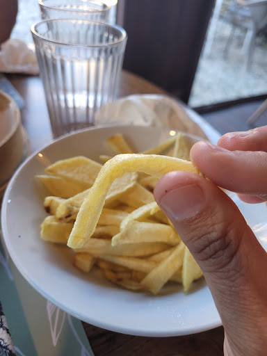 The main course was a complete desaster: I got some kind of fried potatoe slices together with my merluzo in "salsa verde". The so called salsa verde is the exact same garlic olive oil or butter the serve the scallops. It's not a salsa.l at all, just a probably not self produced lily something. The fish was low quality. Definitely not fresh. Super fishy, stinky, not a la plancha, as they call it, but super mega oily. The potatoes were horrible. Uncooked - or in other words raw. And fried, but came still raw and dripping with oil. I complained and asked for at least for French fries instead. The fries came after 20 minutes (which is already ridiculous) and were anything but not crunchy. Have a look at the pic. I told the waiter but there was no reaction again. The raxo of my company was completely dry. Really a poor dish without love. No decoration. No good quality. Nothing.