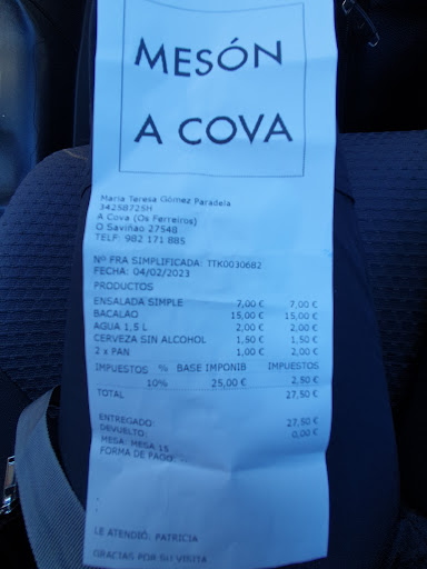 Read moreSe trata de un restaurante que está ubicado en la parte alta de A Cova, aldea de O Saviñao (Lugo). El local, muy amplio, recientemente restaurado, tiene unas vistas espectaculares al paraje del río Miño denominado O Cabo do Mundo, solo por este motivo ya vale la pena venir. Se trata de un meandro entre los concellos de O Saviñao y Chantada. Muy cerca del restaurante se hallan la bodega Adegas Moure, donde se cosechan unos excelentes caldos de la Ribeira Sacra. Un poco más abajo está la mítica Playa de la Cova que también es obligatorio visitar. Ya entrando en materia gastronómica, decir que el menú es variado, casero y delicioso. Todo está exquisito, desde las truchas, pasando por el bacalao, las anguilas el caldo gallego o el churrasco tanto de cerdo como de ternera. Los postres también son deliciosos y caseros (flan de queso, flan de café, tarta de piña...). ¡Que decir del pan de Escairón! El vino tinto de la casa baja muy bien. Sirven la comida muy rápidamente y el personal es encantador. La relación calidad precio es muy competitiva. Por todo ello, y a modo de resumen, se trata de un lugar cinco estrellas, altamente recomendable, en un marcó incomparable. Es obligado...