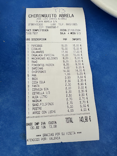 Read moreTras haber realizado una reserva previa para cenar, cuando llegamos no sabían cuál era nuestra mesa a pesar de que el local estaba vacío. Después de repetir 2 veces el nombre al que figuraba la reserva, nos tuvieron esperando un momento y nos sentaron en una mesa. Me dio la sensación de que no constaba mi reserva en ningún sitio. A pesar de ser un chiringuito conocido por sus pescados y mariscos no había mucha oferta ya que muchos de los productos estaban agotados. El servicio fue muy rápido y la comida pasable, solo pasable. La camarera que nos atendió parecía no tener mucha experiencia, no sabía el vino que tenían, tenía problemas con el datáfono, etc. Entiendo que todo el mundo tiene que aprender, pero deberían estar más pendientes, ya que no estaba preparada para hacer el trabajo sola. Y lo peor de todo fue lo que ocurrió con los niños. Cuando estábamos comiendo entraron otros clientes con 2 niños al igual que nosotros. Nada más pedir la comida, el camarero les dijo a esos niños que si se portaban bien tendrían una sorpresa. Cuando los niños acabaron de comer el camarero les trajo una caja con juguetes. De verdad, no entiendo cómo hacen estos desprecios a los niños y les traen juguetes a unos si y a otros no. A veces parece que se trata mucho mejor a la gente de fuera que a los que somos de la zona. En...