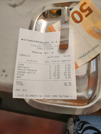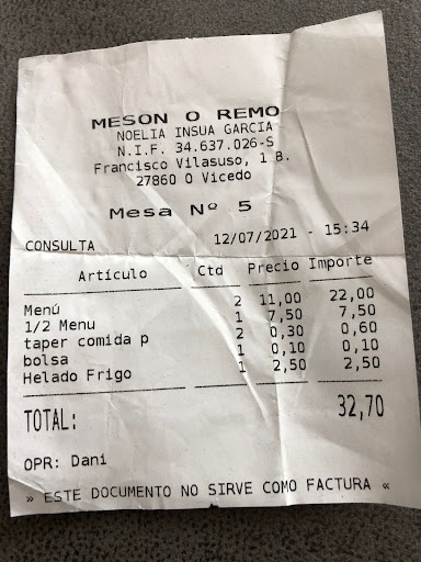 Otros detalles cutres son por ejemplo, que te cobran el tupper y la bolsa cuando pides para llevar a casa, te retiran la botella una vez te sirves el vino del menú y te cobran de más en el ticket. En concreto, me querían cobrar 8 y pico por una copa de vino con casera, que me habían servido los que la tenían incluida en el menú, ya que yo no pedí menú del día.