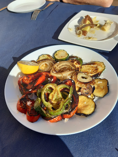 Great food! Grilled vegetables, to die for, mussels great, seabass lovely. Grilled peaches with nuts and vanilla ice cream, yum yum yummie. Fantastic views