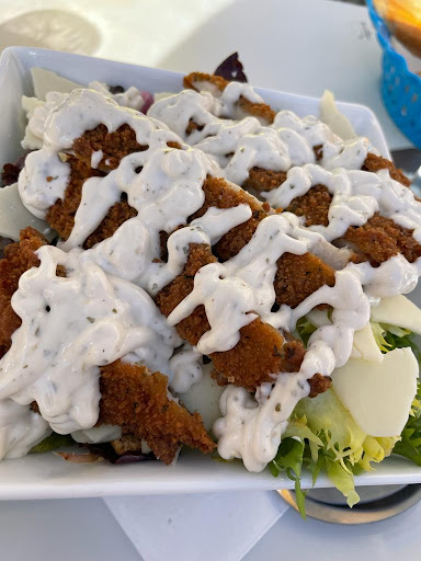 En la terraza con el sol estuvimos perfectamente comiendo. El trato y la atención recibida fue excepcional y encantador. Disgustamos una ensalada cesar, muy completa y buena de sabor. A continuación croquetas variadas y patatas bravas, que aunque estaban fuera de carta no pusieron pegas al realizarlas sino todo lo contrario. Y de postre unas tortitas, y un helado.