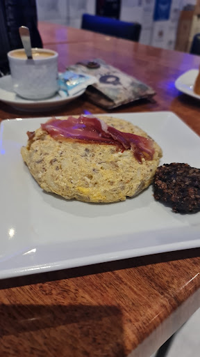 Read moreNo puedo valorar comida porque en la carta no hay ninguna opción vegana,por tanto no he comido nada. Mayormente quise poner reseña porque el camarero que me atendió las dos veces que fui me pareció de lo mejor que me he encontrado en hostelería. Desprende una amabilidad increíble, Un simple café sólo, o una infusión te la pone con una sonrisa y siempre tiene algo para contarte y hacerte más amena la estancia. Recomienda platos o bocadillos a los clientes y por las reacciones de ellos parece acertar . Aunque no pudiese comer nada, si que me fijé que los platos que ponían se veían bastante elaborados, con una presentación bonita. La clientela es variada, aunque Mayormente trabajadores del polígono, o repartidores y así, muchas personas de paso y el ambiente es agradable un local con temperatura y luz agradables, y muy limpio. Aunque sigan sin tener leche de soja para el café (que lo entiendo si vamos pocos clientes que la pidamos) sin duda volvería tanto por el trato como...