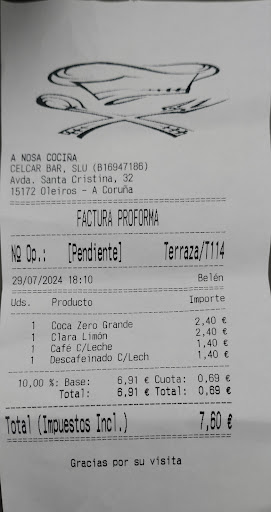 La comida estaba normal. Apunte en la ración de raxo de cerdo porque sabía muchísimo a una especia que creo que era nuez moscada aunque no lo se con certeza. No se si esto es intencional o no, pero si así lo fuera es un mal presagio hacia la calidad de la carne. En fin, que casi no la comí y no me atreví pedirlo para llevar. No supieron decirnos si había sangría o no y sinceramente, creo que la hicieron al chou mirando por un buscador la receta y nos la metieron en el ticket cobrando como si fuera un cubata de marca. Una jarra de tamaño intermedio.