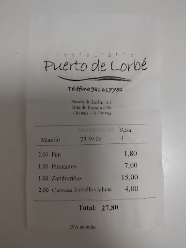 Estás ante uno de esos restaurantes que no quieres dar a conocer de lo bueno que es. Se encuentra junto al puerto de Lorbe, consta de dos plantas, abajo el bar donde también se puede comer y la segunda que es el salón restaurante desde donde se puede ver el puerto y a lo lejos las bateas de mejillones. Puedes comer cualquier cosa, solo con entrar y ver las mesas con lo que pidieron otras mesas nos dimos cuenta que habíamos acertado. Para mí, buena calidad y cantidad, hay que ir con hambre. Empezamos con unos mejillones al vapor, el camarero nos advirtió de que el tamaño no era grande sino medio- pequeño, pero que eran de alli. En realidad queríamos probarlos y no nos importó. No se cómo estarán los grandes pero que ricos los que nos puso. Yo me pedi una nécora, no soy un experto pero no me resultó muy diferenciable de otras ( ojo que estaba rica, pero hubo sorpresa que luego te cuento ), junto con esta nos trajo las zamburiñas del pacífico ( volandeiras creo que las llaman ) muy ricas por cierto es algo que siempre como junto con las zamburiñas, que si te explican sabes diferenciar entre unas y otras sobre todo con el precio. A continuación nos trajo el festival, una parrillada mixta( la mariscada nos pareció mucho viéndolo en otra mesa), ojo lo que nos puso salmón a la plancha, rape, merluza y lubina (creo), gambas, gambon,almejas y mención especial a dos nécoras que ahora sí (sin ser experto) me parecieron espectaculares, nos sobró pescado (que debeis llevaros) y que nos llevamos en un tupper. Como es costumbre, un pan de recuerdo y las "patatas" fritas que siempre te acompañan a lo que pidas. La bebida, los refrescos de 33cl ( cosa de agradecer) y el vino , madre mía el vino, albariño casero (junto con el marisco) se bebe solo y a buen precio. El postre, este os dejo que lo descubráis, nosotros solo pedimos uno porque quedamos muy bien, pero que nos comimos entero y es de recordar. Café de puchero, cada uno con sus gustos, yo acepté y acerté. Si salís muy llenos podéis daros un paseo por el puerto que queda muy cerca.