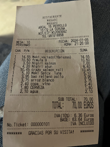 Our family husband and I with our two year old ate here, had a hair on our sushi. We ate all but the one because they only come to the table to deliver food or place an order. They kindly replaced it with a few extra. That was nice but not asked for. We never got our crazy salmon roll but we were charged for it. We have always had lemon with our fish and of all the countries this is the only place that did not have any lemon, but had a bar? Is didn’t help that out Spanish is not perfect but it has never been this difficult to order and eat at any restaurant. I will say the tuna is by far better than many others...