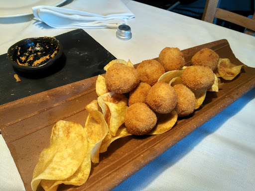 Muy grata experiencia por la amabilidad del servicio. Un ambiente acogedor, cálido, de ambiente marinero, con paredes blancas y enlucidos en azul, bien iluminado, aún y a pesar de estar en una planta baja, si bien disponen de terraza en el exterior, cubierta y a salvo de la eventual lluvia, que ayer, brevemente, hizo acto de presencia. Comenzamos con unos langostinos crujientes con salsa kimchinesa. Muy ricos, generosos en tamaño y justo rebozado. La salsa, con un leve toque picante, el suficiente para aportar sabor, quién sea amigo de este complemento, pero sin enmascarar al protagonista, el crustáceo decápodo. Muy sabrosas las "flores" de alcachofas con papada de ibérico y salsa romesco. Cada bocado un deleite. Muy apetitosos los huevos rotos con trufa y parmesano, sobre cama de patatas fritas. Este típico plato sencillo que, en un momento dado, no cambiarías por por el más sabroso de los mariscos. Vosotros sabéis a qué me refiero. No hubo lugar a postre, pues quedamos satisfechos con lo servido. Muy buen espresso, otro...