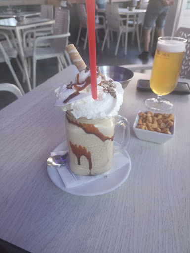 Un muy buen sitio para ir tanto si quieres tomar un café, una cerveza, una copa o incluso si quieres comer algo. En la entrada podrás encontrar una zona de terraza cubierta y con cristaleras, en la cual se puede está bien cuando llueve o si no llueve ya que las cristaleras las abren al completo y tiene muy buena ventilación, hay un coche de los que se le hecha la moneda para los niños en el caso de que los lleves siempre que sea en horario apropiado, también hay un televisor. Pasando la zona de terraza encuentras la zona de cafetería con mesas y con la barra, se podrá ver también una vitrina con postres como tarta y otros elaborados. Siguiendo hacia delante encontrarás unas escaleras en el centro las cuales van hacia abajo y otras a los lados las cuales van hacia arriba a una zona como de palco (una zona VIP con cristaleras). Las escaleras que van hacia abajo te llevan a una zona con unos sillones, una zona más de copas, en la que podrás encontrar un futbolín por si quieres hechar un rato con l@s amig@s o para que los niños estén entretenidos. Si sigues hacia delante, pasando una puerta, encontrarás la zona de copas, en la que habrá una zona donde poder bailar, una zona con dj, he incluso otra barra en la que poder pedir tus copas sin tener que ir a la barra de la primera planta. Lo recomiendo tanto para gente que quiere tomar un café con niños o sin niños, gente que quiere tomar una cerveza, o tomar unas...