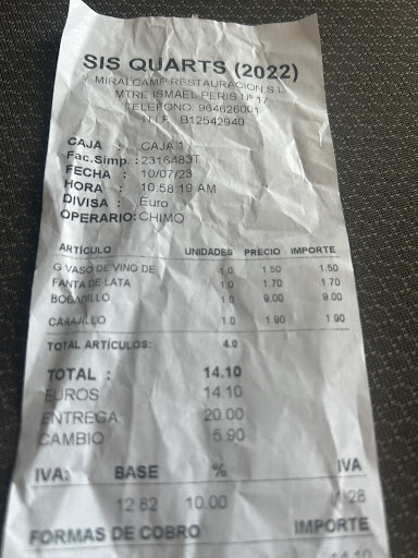 El servicio es bueno,El servicio es bueno la comida aceptable, la comida aceptable pero que te cobran nueve euros por pedirte un bocata XL es un robo, pero que te cobren nueve euros por pedirte un bocata XL es un robo luego manifesté que no estaba de acuerdo y creo que es la cocinera me habló un poquito mal solo porque dije que iba a publicar la foto. luego manifesté que no estaba de acuerdo y creo que es la cocinera me habló un poquito mal solo porque dije que iba a publicar la foto se supone que un bar de polígonos para trabajadores no para que te cobren 14 € por un almuerzo porque te pidas el bocadillo un poco más grande ya que el tamaño de ellos es bastante pequeño, en este polígono hay bares que están cerca de este que por siete euros almuerza de maravilla.en este polígono hay bares que están cerca de este que por siete euros almuerza...