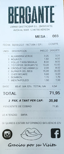 El total de la cuenta fue de 71'95€ a 35'98€ por persona, la verdad que no nos pareció caro, para la cantidad y la calidad de la comida.
