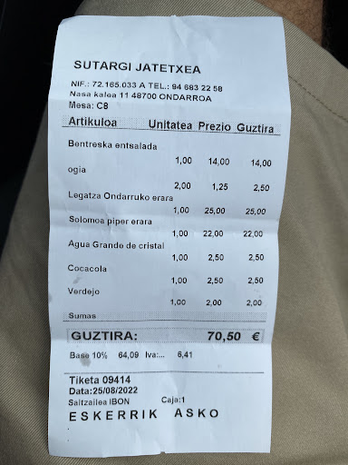 Read moreDecepcionado con la comida, el espacio y la atención. La comida, ensalada de ventresca - o mejor dicho, ensalada de tomate con 4 trocitos de ventresca, literal y 14€ - la merluza, plato estrella, cruda, que se veia roja, la piel estaba tan pegada que no se podia separar, de lo cruda que estaba (algunas partes) y bañada en aceite. El solomillo, de un inicio se pide MUY HECHO. Lo traen crudo y sangrando. Lo pido que por favor, lo pasen in poco mas. A todo esto ya 40 minutos de espera. Las patatas de guarnición, frías e inundadas en aceite. Lo traen por segunda vez. Lo abro un poquito mas, crudo. Intento comer, pero sigue por dentro crudo. Ni siquiera esta al punto. Corto todos los trozos abiertos y pido por favor que los hagan, que sigue estando cruda. Se lo llevan y lo traen, con la frase “a ver si a la tercera va la vencida” - a ver si a la primera se hace como se pide -. Consigo que este hecho y me lo como, ya sin guarnición, con la salsa de pimienta fría e insipida. El espacio, diminuto, tanta gente chillando en tan poco espacio, no se podia mantener una simple conversación. En cuanto a la atención, pues que decir, además de una camarera que ni mira a la cara, que preguntas y no explica y te lanza literalmente la copia del pago a la mesa. No sé si se ha tratado de mala suerte, y hemos topado con un mal día, porque no entiendo las críticas tan positivas que tiene. El resumen es decepcionado, hambriendo y un poquito robo. Pd el pan te lo cobran y está malo y...