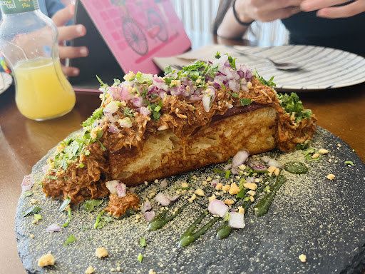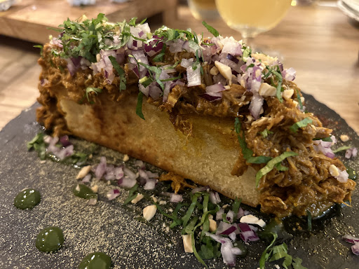 Es un sitio agradable para picar algo, pequeño y algo escondido, pero agradable con una terraza que da a un parque y decorado de forma muy original. La comida bien, pero sin motivo para volver. La carta me pareció muy corta ya que los tacos solo los sirven jueves, así que quedaban relativamente pocas opciones. El pollo nosequé (con un rebozado especiado y salsa) estaba brutal y la ración de tamaño correcto para picar varios trozos cada uno entre dos adultos y dos niños. El ceviche sin embargo era una cucharita por persona y tremendamente flojo. Le faltaba sabor, picante, acidez, sal, leche de tigre y por supuesto cantidad. Estaba bien elaborado, pero yo le daría una vuelta importante.