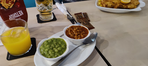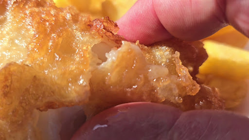 The positive reviews of the establishment are perplexing, as my experience was far from satisfactory. The fish was broken into two pieces & appeared to be pre-battered, the type sourced from a supermarket freezer, I do not believe for one minute that it was freshly battered in the kitchen. The fillet contained worms that had not been removed during preparation. The batter was excessively oily, and the fish had an unusual, stodgy white texture, as can be seen in the photographs. It was not nice at all, the worst that I've had, I believe. The chips were mediocre at best, not lovely full length chippy chips but half length chips, while the peas were acceptable.