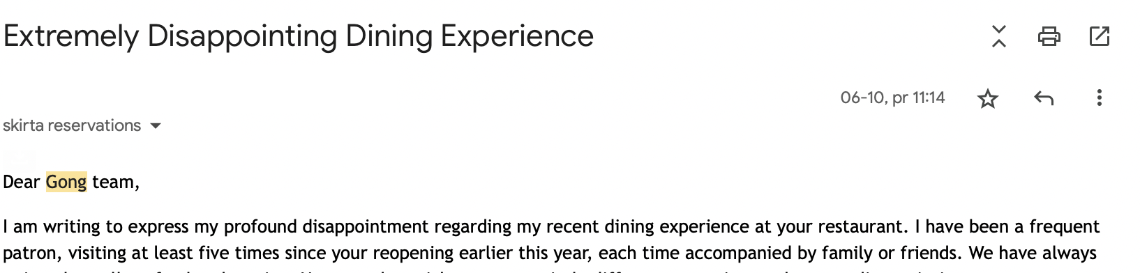 I am writing to express my profound dissatisfaction with a recent dining experience at your restaurant, coupled with the unacceptable delay in responding to my emails over the past 16 days. Despite several attempts to contact the restaurant for an explanation, my efforts have been ignored, leaving me no choice but to express my grievances through this review.