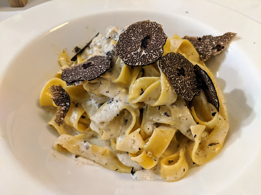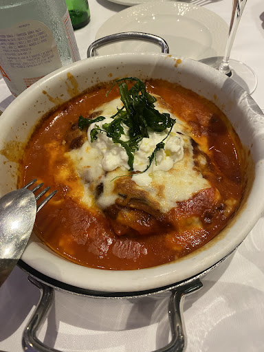 Welcome - flawless, helpful Initial order - no explanation of where to find the menu, and the direct question of whether to put champagne or cocktail. I would almost say how fast to make money on unoriented guests. Follow-up service without errors. Just at the end of a long wait for coffee. And to eat: Pastries, mortadella - great. Appetizers: Burrata, Mussels, Bruschetta, Melanzane absolutely perfect. Main dishes, Carbonara, Ravioli di carne - great. Beefsteak - tragic, tendon inside, so made of inch sirloin. This is not a steak! And overall very cool right after serving. Extremely cold squid, chewy and a small portion as a main course. Desserts very good .. We will...