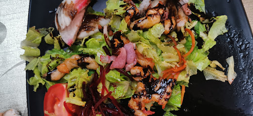 For some reason, all plates were ‘decorated’ with paprika (bell pepper) powder, partially covering the dish itself too. The prawns were half raw, which we pointed out and they were taken back to be grilled some more, which indeed helped, yet caused them to be more dry. The squid was not grilled enough, yet was still burned and covered in an indefinable sauce. As for the salad, it had cold bacon bits and dry chicken pieces on it that still contained splinters of chicken bone. The whole salad was overly covered with balsamic cream, including the bacon & chicken. So generously in fact, that everything had only that one flavor. The patatas bravas were fried potato cubes with "sweet hot ketchup" from a squeeze bottle, nothing in the least close to the spicy sauce (whether with or without tomato) so well known. When we mentioned that, all we got at first was a “sorry” from the wandering off waitress. Later she even admitted the sauce came out of a bottle and was not freshly made.