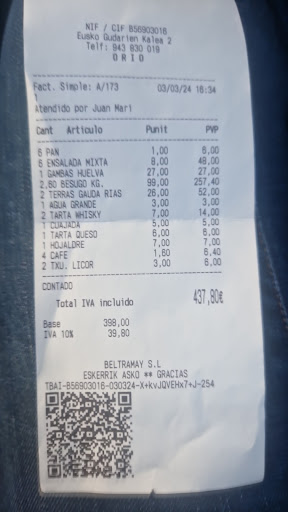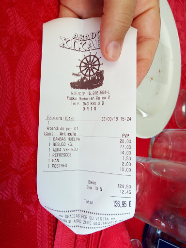 Fuimos a cenar cuatro persona y pedimos una ensalada mixta de entrante, un besugo y un rape, ya que no les quedaba rodaballo. De postre una cuajada muy normalita, un helado de almendra con turrón muy bueno, un hojaldre y un queso Idiazabal con membrillo.