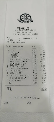 Read moreA ver, excelente en calidad precio y servicio. Si lo comparas con otros restaurantes de Oropesa más caros deberían darle una estrella Michelín. Recomiendo pulpo, calamares de la Patagonia y Solomillo, eso es lo que comimos pero me da que el resto estará al mismo nivel. Hasta los postres caseros son muy buenos, y para los amantes del orujo autóctono de Galicia, paso obligatorio. Let's see, quality excellent with cheap price. If you compare it with another more expensives places in Oropesa A Roda should have a Michelín Star. I I highly recommend the octopus at starter and Solomillo. Best orujo Gallego licuor un Castellón. The home made dessert are...