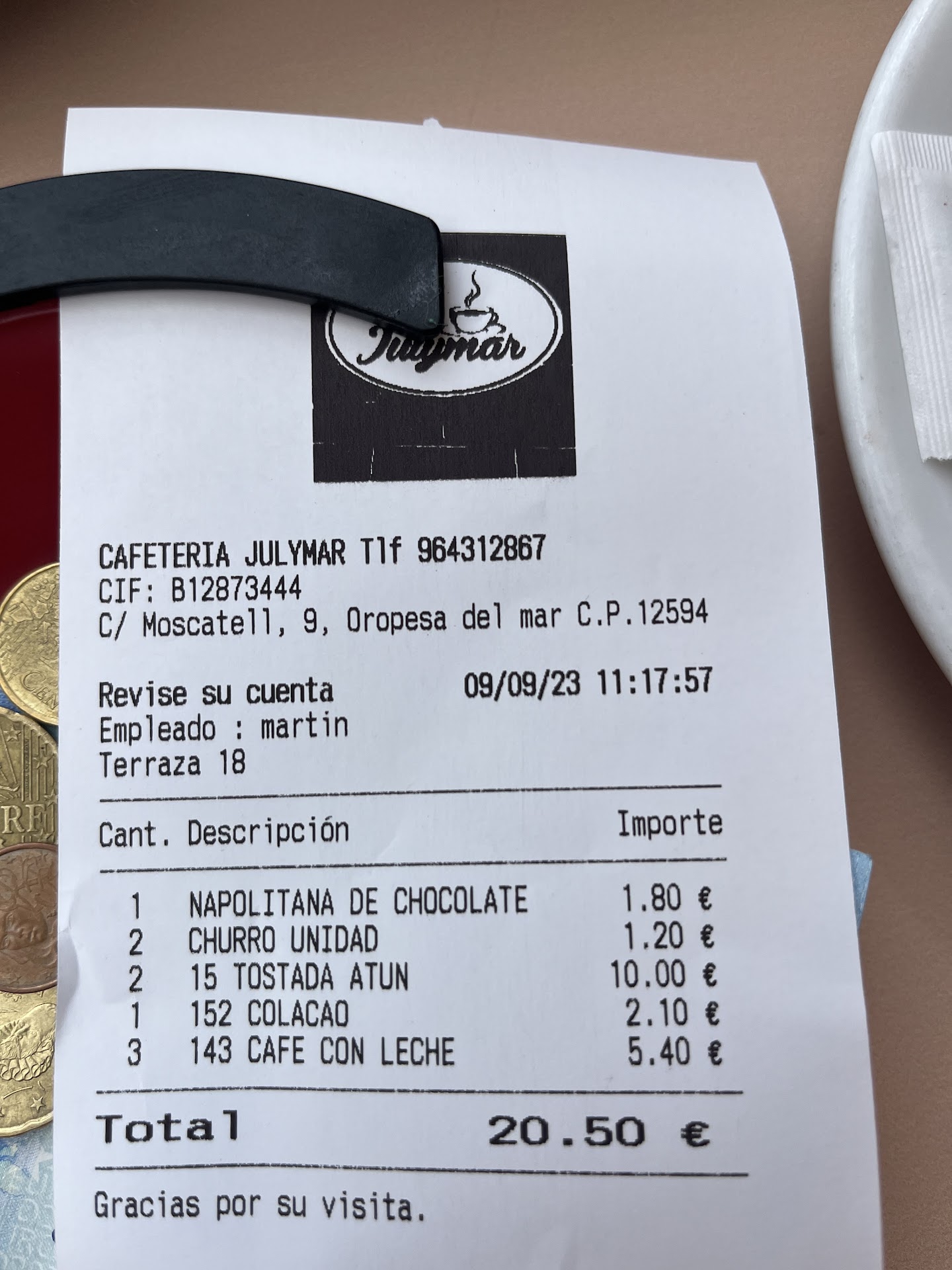 Read moreTres veces pedimos la cuenta y al final sorpresa! Un auténtico “saca cuartos” … un mollete de atun y tomate mas un cafe 6,80 ya sabemos a que sitios no volver si quereis seguir viviendo del turismo teneis que cuidarlo ya que marina d’or esta que se pueden grabar peliculas de terror…