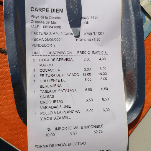 Read moreUno de los peores lugares que he comido en Oropesa. Le doy 5 estrellas porque son las reseñas que están primero. Llegamos en semana santa sobre la hora de comer y teníamos hambre, fuimos al Chulvi y no tenían mesas disponibles, decidimos ir a este Carpe Diem. El menú por 15 con céntimos no recuerdo con exactitud había paella que nos dijeron recién salida y caliente y si estaba caliente tenía unas gambitas minúsculas y un muslitos de pollo crudo nada más de segundo filete de ternera y dos trozos de carne que quizá pesaran 100gr si mucho unas 5 patatas fritas, postre una tarta congelada malisima. Un timo total comida y productos de mala calidad y la atención pésima por parte de la camarera. Este lugar ni para beber una cerveza. Lo que cobran por menú es mucho para lo que sirven y la...