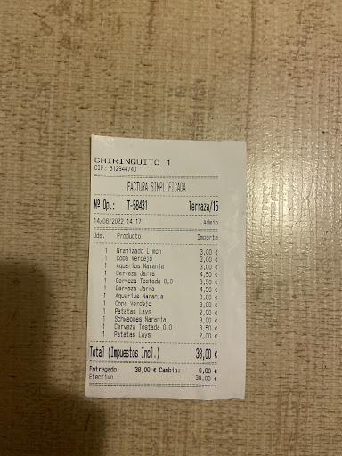 Hubiese preferido ver las reseñas antes de sentarnos. Estábamos buscando un lugar para picar algo y disfrutar nuestra última noche en Oropesa. Nada más pisar el lugar, esperamos a que se acerquen para que nos asignen una mesa...al final nos acercamos nosotros porque nos miraban y quiero creer que estaban ocupados con las 4 mesas que tenían( solo 1 de ellas estaba con comida y las otras ya tenían sus bebidas) que no pudieron ni preguntarnos qué queríamos. Al querer sentarnos les pedimos que nos secara la silla que estaba mojada, pero iba trayendo una bayeta en lugar de papel...menos mal que queríamos que esté seco. No nos habíamos sentado(estábamos esperando que viniera el chico con el papel a secar las sillas) y nos aborda una chica ya tomándonos nota(estábamos de pié y ya quería que pudiéramos) No pasa ni 1 minuto que nos habíamos sentado y se nos acerca la chica otra vez y nos toma nota, le pregunta mi pareja si tenía AQUARIUS, a lo que ella responde que sí, mi pareja vuelve y le pregunta "AQUARADE no, Aquarius" la chica sin mirar y tomando nota le dice "Sí, sí". Esperamos y vemos que traen nuestra bebida pero para nuestra sorpresa ...traen AQUARADE (que no queríamos y ya habíamos preguntado que marca era) le decimos al chico que no lo queremos y solo nos quedamos con las 2 bebidas (en total eran 3) En fin, cuando ya teníamos la bebida esperamos a ver si venían a tomarnos nota de la comida...nunca vinieron. Habían 5 camareros si no recuerdo mal, y todos ellos haciendo de todo menos estar pendiente del cliente( bebiendo y brindando, con el móvil, hablando entre ellos...) Cuando pedimos la cuenta no tardaron ni 1 minuto en traerla(eso quiere decir lo mucho que quieren trabajar) 13€ y pico 1 jarra de cerveza y 1 tinto de verano? Pues no! Querían cobrar el AQUARADE que no queríamos desde un principio y que devolvimos. Cabe recalcar que íbamos 2 adultos, 1 niña de 12 años que iba mala del estómago, 1 niño de 3 años al que no le gusta el AQUARADE y 1 bebé. Volveremos a Oropesa el próximo año, pero ya tenemos sitios donde ir y 1 sitio al que no volveremos . Tiene mucho potencial el lugar, lástima de lxs camarerxs que hacen tener mal rato en...