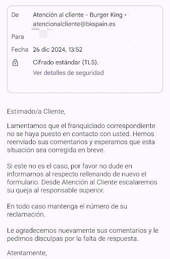 Read moreLlevo ya varios pedidos ( incluidos pedidos en local) en los que siempre falta algo del menú hasta ayer que fue la gota que colmo el vado. Realizo un pedido vía app de 4 menús tardan más de 45 min en traerlo y antes de recibirlo la app me indica que ya está entregado. Llamo al local y la culpa, según ellos es del repartidor, cuando esté viene las bolsas del pedido están chorreando ( por lo mucho que llovía) así que mientras mi marido le paga abro una de ellas y veo que de 4 bebidas solo vienen 3, el repartidor dice que ya se ocupa el de llamar y que nos la traigan, se va y al ir a repartir las hamburguesa vemos que falta una. De nuevo llamo al local (21:16) y les digo lo que pasa y me dicen que si la hamburguesa esta aquí está ahora se la llevan le comento también lo de la bebida, esperamos y pasados 30 min llamamos otra vez porque seguíamos sin hamburguesa y nos dicen que no nos preocupemos que el repartidor está en el portal (9:46) pasados 10 min nos timbra y cuando llega solo con la hamburguesa le preguntamos por la bebida y nos dice que no sabe nada, le pedimos que llame al local y pregunte que pasa y se muestra reacio al principio al final llama y nos dicen que si queremos que nos devuelvan el dinero le decimos que no hemos pagado por un menú para cenar y lo queremos completo. Total que una cena que en condiciones normales empezaría sobre las 9:10 cenando los 4 juntos terminó cer a de las 23:00 cenando yo sola porque mis hijas y mi marido ya estaban haciendo la digestión. Es vergonzoso en lo que a mi respecta no volveré a consumir en burguerking ourense la experiencia ha sido nefasta en los 2 locales...