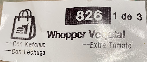 Segundo, mi opinión de vuestra comida después de haber comido en vuestra restaurante varias veces es la siguiente... realmente necesitáis sincronizar vuestra sistema informático que el cliente utiliza para pedir con lo que se imprime en la etiqueta para que el empleado prepare el pedido. Un ejemplo que ocurre TODO el tiempo (hoy incluso): Pedimos dos Whopper Meals. El primer pedido: tomate extra, lechuga extra y ketchup extra. Lo que se imprime en la pegatina para el empleado es: (con Ketchup, con Lechuga, Extra Tomate) por lo tanto nunca consigo mayonesa, cebolla o pepinillo (que me encanta) y no hay lechuga ni ketchup extra. Esto es un gran problema cuando se espera que alguien lo haga correctamente. El segundo pedido: extra de tomate, extra de lechuga, extra de ketchup, sin pepinillo, sin mayonesa. Lo que se imprime en la pegatina para el empleado es: (sin mayonesa, sin pepino, con lechuga, con ketchup, tomate extra) por lo que este no tenía cebolla ni lechuga y ketchup extra que debería haber tenido. Por favor, de alguna forma arregláis esto.