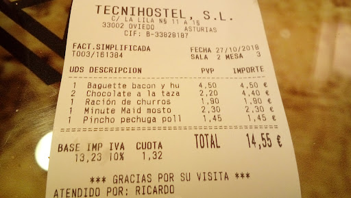 Buena ubicación. En mi caso, buen servicio. Cafetería con decoración de aire moderno pero de tendencia más bien clásico por su diseño. Esencialista. El acceso se hace a través de de grandes lunas de cristal que funcionan como ventanas o fuente de iluminación y como parte de su estética. Próximo al Centro Comercial Salesas y a unos 40 metros de la céntrica calle Uria, vértebra de la ciudad oventense. Esta cafetería está puerta con puerta con popular casino. Es fácil confundirse de entrada dada su proximidad uno con otro. El servicio correcto. Limpieza, bien. Precios medios altos, como acostumbran a serlo en loa locales de esta zona por su céntrica localización. Variedad de pinchos y "baguettes" .Chocolates. Churros. Refrescos. Menús y medios menús a precio razonable. Si vais a tomar un pincho (en otros lugares conocido como sándwich) , fijaos bien antes. Aseguraos de que pedís un pincho de precio normal de precio 1' 45 euros .El precio cambia a precio notoriamente más elevado según el tipo de pan ; si es pincho de baguette, que es un poco más grande ,no mucho más que un pincho de tamaño convencional y el pan es el.mismo ( la diferencia de precio entre un pan normal y un pan de baguette en cualquier comercio es el mismo o casi lo mismo) y tres veces más caro que un pincho normal. Pedid dos pinchos normales de precio normal y os ahorrais un tercio. Chocolate bien. Raciones de churros generosos ( seis churros grandes ,, en esto un 10 ,en otros lugares las raciones son raquiticas) .Es un lugar agradable. No le pongo más estrellas por el precio del pincho a 4'50 que, incluso en lugar como este, es desproporcionado.Se añade que cuando se pudieron los pinchos, al estar todos en la misma urna de cristal, no se sabía que habia diferencia de precio, ni separadores con indicadores de diferencia de precio tan grande. Deberían poner algún tipo de indicación al consumidor antes o avisar de la gran diferencia de precio. Coste de churros y chocolate medio alto acorde con el lugar. precio refresco ,moderado alto. Tiene terraza. Dos, para ser exactos. Grandes en zona peatonal. Es un lugar que está bien. Con el toque característico de la vetusta Oviedo. Podría mejorar mucho .Para público de cierta franja de edad. No es un lugar ideal para jóvenes o para tomar una copa.Es un lugar...