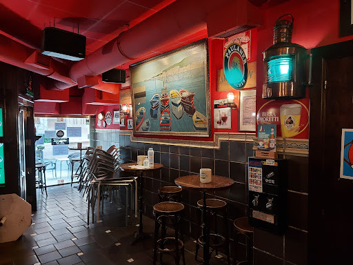 La terraza es muy pequeña pero si ves este local por dentro la terraza te va a importar entre poco y nada: luz rojiza, decoración clásica con multitud de cervezas expuestas, mesas de madera, bancos de pared corrida en la planta de arriba...