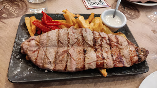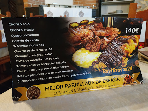 Read moreEs un local curioso, con un ambiente bastante heterogéneo y que no acaba de combinar bien: desde paisanos locales, mozas hermosotas en sus mallas a reventar... hasta urbanitas curioseando por el local. En todo caso, el local estaba a reventar. Algo bueno es que al fondo tienen una especie de sala para los niños y eso permite al resto de comensales y habituales comer y beber tranquilamente. La comida que ofrecen es la habitual con respecto a lo que se suele ofrecer en casi todos los locales asturianos, sin embargo, el foco de atracción es la parrilla, desde que consiguió un premio. En general, la decoración del local es curiosa por la mezcolanza de estilos sin ton ni son, ni kitsch ni buscado. Simplemente es así: puesto en un principio con cierta línea de estilo y con el tiempo reponiendo cosas sin más. Da impresión de desorden en algunos casos: cajas de sidra en medio del comedor, cuberteras frente a las mesas, etc. Los camareros muy amables y atentos, aunque a veces algo distraídos y malamente uniformados y aseados. Comimos bien de parrilla (no la estrella de la casa, porque sería imposible para dos): tanto el entrecó como el solomillo estaban más que correctos. La guarnición eran patatas, muy bien hechas, deliciosas. Pero, en general nos desilusionó un poco, probablemente porque nuestras expectativas eran muy altas. No creo...
