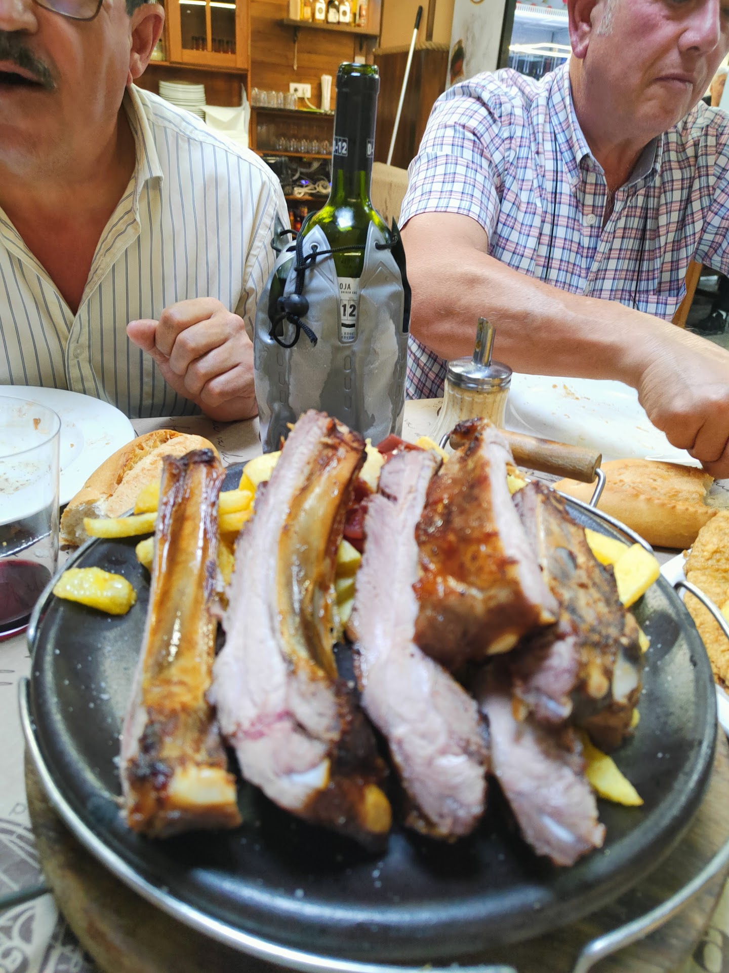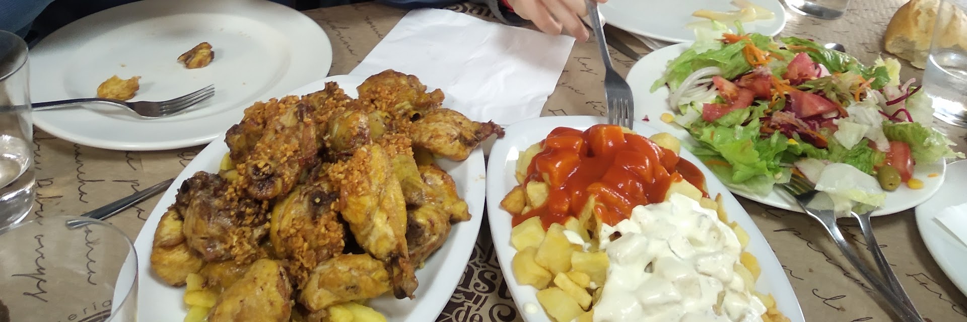 Las raciones son muy abundantes, tanto que la mayoría de la gente no llega a terminarlas, y nosotros tampoco pudimos. Probamos las fabas, que estaban realmente buenas, y el plato parrilla, que trae un par de costillas, un criollo y patatas. Yo pedí además un cachopo de cerdo, que también estaba muy rico.