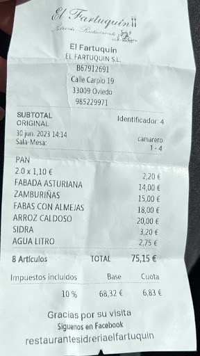 Read moreFuimos a reservar en persona con una semana de antelación y preguntamos si habría menú del día. Nos dicen que sí, pero especial, por ser festivo (más caro que el diario). Llegamos el día de la reserva a comer y nos dicen que no hay menú. La camarera, muy amable, nos remite al encargado, que con educación nos dice que debió de ser un malentendido y no pueden hacer nada. Esto es algo bastante lamentable, porque de saber que no había menú no hubiéramos reservado aquí. No nos ofrecieron ninguna solución y tampoco tuvieron ningún mínimo detalle con nosotros. Lejos quedan los tiempos donde en hostelería se cuidaba al cliente. Pedimos fabada y cachopo para compartir entre dos. La fabada muy rica, aunque el compangu bastante normalito tirando a malo, y el cachopo muy bueno también, aunque viene con una guarnición de patatas superescasa, saladas y un trozo minúsculo de pimiento. La ensalada de tomate era eso, tomate. Bien aliñado pero con muchísima sal. El rollo de repollo relleno de setas y gambas muy rico y contundente. Las cebollas rellenas de bonito bien de sabor, pero muy pequeñas. En mi opinión lo mejor los postres. Es de agradecer que valgan 5€, cuando estamos ya viendo precios de 7 e incluso 8€, lo que antes costaba un menú, y además son porciones decentes. La tarta de chocolate muy rica, la de turrón normalita, la de almendra de las peores que he probado, superseca, y el arroz con leche bastante bien, aunque demasiado azúcar para mi gusto. Casi 120€ para 4 personas. Con eso antes te tenían que sacar en carretilla del garito; hoy llegas a casa y te pones a picar algo para matar el hambre. Para terminar, mencionar que nos sentaron en una mesa superincómoda, pegada a una columna, tocando a los comensales de la mesa de al lado, sentados en taburetes como si estuviéramos en la barra y con un calor tremendo, sin aire acondicionado y con el ventilador del techo casi parado. De hecho los trabajadores estuvieron todo el tiempo que estuvimos allí quejándose del...