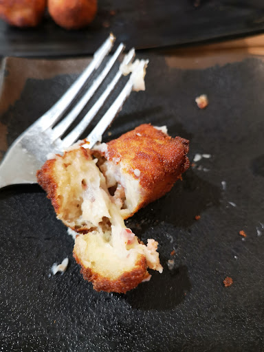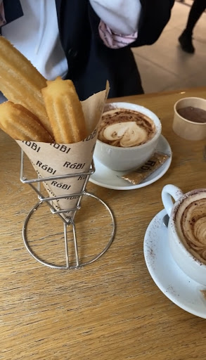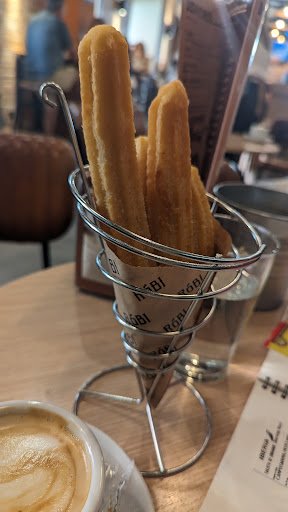 On a very rainy day in Oviedo we were looking for somewhere to stop for a drink and some food. We fortunately stumbled into Robi and managed to snag a table as it was very busy. The waitress spoke a little English, and myself a little Spanish, and together, along with hand gestures and sometimes us just saying "Si" to everything (despite not understanding) resulted in us having a wonderful afternoon of drinks and tapas. At the end we were stuffed and politely declined any postres (dessert) but our lovely waitress still came over with two churros with some chocolate sauce on them (on the house). Cannot recommend this little gem enough -...