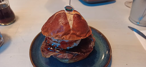 La Asturiana 17.50€ Pan pretzel, carne de chuletón, cecina y queso de cabra ligeramente fundido con su salsa de mermelada de pimiento dulce confitado con un ligero contraste picante.