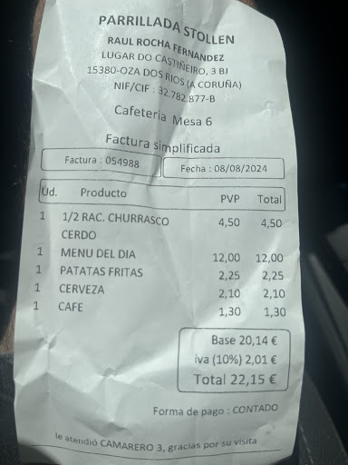 Read moreExcelente churrasco. Buena atención. Rapidez y profesionalidad. Muy bien la Cantidad y la relación calidad-precio. Ya lo conocíamos de su anterior etapa en A Coruña y continúa sirviendo el...