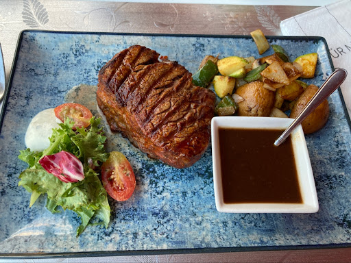 It fits more for German customer-German music (which should be a bit quieter), German language as a preferred language. But even if you are English (or other language ;)) speaking customer you are very welcome! A gift from the kitchen you can eat as a small aperitif. A big surprise, when ordered Angus steak which was a premium high quality! I never ate so delicious, perfect medium done steak! With steak came wedges with pepper, salad and wild mushrooms sauce - Everything would highly recommend!! And on the end I got a free Baileys drink. I would change one think - people who smoke that they are not allowed to smoke at the table. It’s not nice when you was a pleasant meal and...