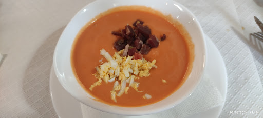 Es un menú del día (entrante, primero, segundo, pan y postre/café), con la bebida a parte. La comida es generosa, empiezan con una tapa de chorizo y morcilla a la brasa, y luego pedimos migas y salmorejo, y de segundo cabezada. Las migas estaban algo secas, el salmorejo no tenía ningún secreto, pero la cabezada al ser a la brasa estaba bien hecha y jugosa. Patatas a lo pobre (quizá algo pasadas de sal).