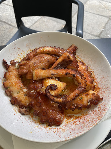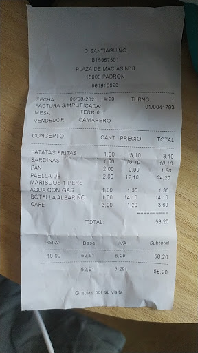 We are walking the Camino Portuguese and arriving in Padron at 16.10 found very few restaurants open. We should have heeded the other reviews on this platform and‘walked on by’. We arrived at what appeared to be a locally favoured establishment. We found a table outside on ‘the Terrace’ and waited for someone to serve us. We waited about 10 minutes before I got up and went in to the restaurant bar area to let the two staff (a lady who was behind the bar and a young man who was serving) that we were seated outside and wished to order food and drinks, requesting a couple of menus. I was acknowledged and handed the menus. I went outside to my table and the three of us decided what we were eating and waited to be served. We waited and waited and waited, at least 10 minutes! Finally I called over to the young man who was chatting with some females at another table (teaching them how to count in Spanish) asked him to please take our order. He eventually dragged himself away from the female attraction and we ordered two Chorizos Vino Blanc, Paella (which was a sharing dish) 2 Cocacola and a tonic water. Then we sat back and waited and waited and waited until finally one of the Chorizo Vino Blanc arrived (no bread basket) and we waited for the second one to arrive but it didn’t so we decided to get on and started eating. After 10 minutes of waiting the second Chorizo starter arrived (we had finished eating the first one.) The Paella arrived and we waited for the Churrasco Ternera to arrive before starting to eat our Paella but after 10 minutes of waiting we decided to eat before it got too cold. We had finished eating our paella and the Currasco Ternera still had not arrived so we called the young man over and asked him what had happened to it? He replied that he didn’t realise that we ordered it (he wrote out our order in the first instance) so we told him again what we had ordered and he disappeared into the restaurant. After 15 minutes of waiting it finally arrived. A lovely lady came to clear our table (which had not been cleared between courses) and asked us if we wanted to order deserts. We decided that we would have coffee, pay and leave. She was very efficient and friendly, helping us with our very poor Spanish translation. We paid an awful lot for very poor service, standard of food and very little atmosphere. The fact that we had to pay more to sit outside in a public square is disappointing. I strongly recommend that you’walk on by’ as there is a much better option just around the corner opposite...