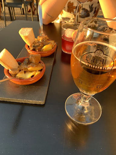 Llegamos antes de lo la hora que teníamos reservada y decimos tomar una cerveza en la terraza. La consumición, muy bien de precio, venía acompañada de una tapa de carne estofada con patatas muy buena. Además, tuvieron el detalle de servirla en dos cazuelitas separadas.