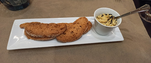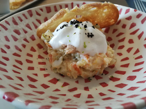 Read moreSorpresa que al lado de casa podamos tener un restaurante de "Categoria". El local es precioso y el ambiente de colores cálidos y la música nos hacen pasar una comida-cena muy agradable. La atención correcta. La camarera más simpática que el camarero. El tiempo de espera fue el adecuado. Había gente dentro y en terraza así que entendemos que tarden un poco en tomar nota para la comida y nos adelanten un detalle de la casa (hummus con unas tostas), las bebidas si las sirvieron enseguida. La carta es variada y los precios no me parecen excesivos. Pedimos: dos buñuelos de bacalao, dos "figatells de sepia y langostino", el pulpo frito y el revuelto de boletus, langostino y panceta ibérica. Y un postre (pastelito crujiente relleno de crema y frutos rojos) para compartir. Todos los platos muy bien presentados y ricos. Solo puntualizo que el buñuelo sabía más a patata que a bacalao, pero era grande y crujiente. Volveremos para probar más platos del...
