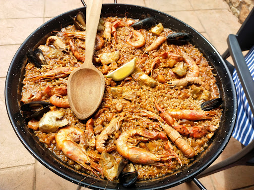 Fuimos un grupo grande a celebrar la verbena en el mismo camping, y aprovechamos que había restaurante para ir a comer. Tenía entendido que el propietario tenía buena mano con las paellas y fuimos a probar.